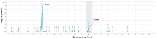 Standardized S. horneri extract (production code name: AB_SH) was provided by the Acebiome Inc. R&D center (Daejeon, Republic of Korea). S. horneri was purchased from Ohta Foods Korea Co. Ltd. (Wando, Republic of Korea). For the preparation of AB_SH, about 30 kg of dried S. horneri was weighed and extracted in boiling water. The extract solution was filtered and concentrated. To remove arsenic from AB_SH, the concentrated extract solution was then mixed with an arsenic absorption carrier (Ohta Foods Korea Co. Ltd., Wando, Republic of Korea). Then, the mixture was filtered and concentrated. The concentrated extract was spray-dried to give an extract powder of AB_SH. AB_SH was standardized using fucose, a major monomer in fucoidan from S. horneri, as a reference compound, via high-performance liquid chromatography (HPLC). AB_SH was hydrolyzed, and a derivatization reaction with 3-methy-1-phenyl-5-pyrazolone (PMP) was performed according to the method described by Lee et al. [13]. This derivatization method was developed for the analysis of carbohydrates via HPLC [14].