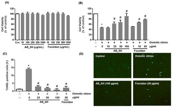 A 500 mOsm hyperosmolar medium was obtained by adding NaCl. Assays were conducted using isotonic (300 mOsm) or hypertonic (500 mOsm) media containing AB_SH (10~100 μg/mL) or fucoidan (1~50 μg/mL) for 24 h. Based on the fucoidan content of AB_SH, we determined our doses of fucoidan. As described above, an MTS assay was used to determine cell viability. Following the manufacturer’s instructions, TUNEL staining (Roche, Mannheim, Germany) was used to detect apoptotic cells.