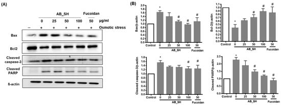 Effects of AB_SH and fucoidan on the protein expression levels of Bax, bcl-2, cleaved caspase-3, and cleaved PARP in corneal epithelial cells under hyperosmotic conditions. (A) Representaitive western blot images. (B) Quantitative analysis of expression of Bax, bcl-2, cleaved caspase-3, and cleaved PARP. Data shown are mean ± SE (n = 5). The significance of differences among means was evaluated using a one-way ANOVA with a Tukey’s test for multiple comparisons; * p < 0.05 vs. non-treated control group, # p < 0.05 vs. osmotic stress-treated group.