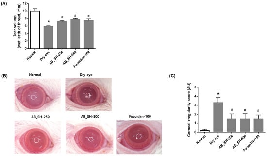 Effects of AB_SH and fucoidan on tear secretion (A) and corneal irregularity (B,C) in unilateral exorbital lacrimal gland-excised rats. Data shown are mean ± SE (n = 10). The significance of differences among means was evaluated using the one-way ANOVA with a Tukey’s test for multiple comparisons; * p < 0.05 vs. normal control group, # p < 0.05 vs. dry eye group. Normal control rats: Normal, lacrimal gland-excised rats: Dry eye, 250 mg/kg AB_SH-treated rats: AB_SH-250, 500 mg/kg AB_SH-treated rats: AB_SH-500 and 100 mg/kg fucoidan-treated rats: fucoidan-100.