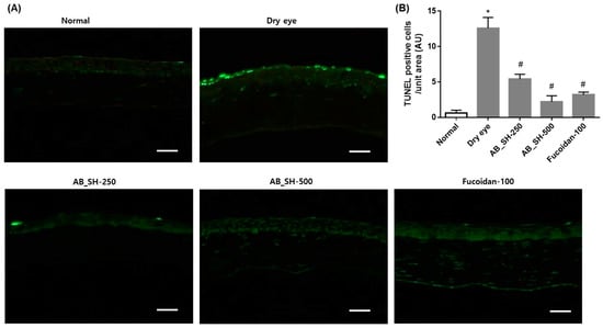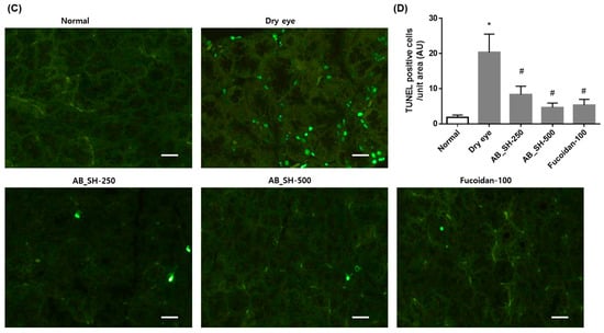 Effect of AB_SH and fucoidan on apoptosis in corneal epithelium (A,B) and lacrimal gland (C,D) using TUNEL staining. Scale bar = 100 μm. Data shown are mean ± SE (n = 10). The significance of differences among means was evaluated using a one-way ANOVA with a Tukey’s test for multiple comparisons; * p < 0.05 vs. normal control group, # p < 0.05 vs. dry eye group. Normal control rats: Normal, lacrimal gland-excised rats: Dry eye, 250 mg/kg AB_SH-treated rats: AB_SH-250, 500 mg/kg AB_SH-treated rats: AB_SH-500 and 100 mg/kg fucoidan-treated rats: fucoidan-100.