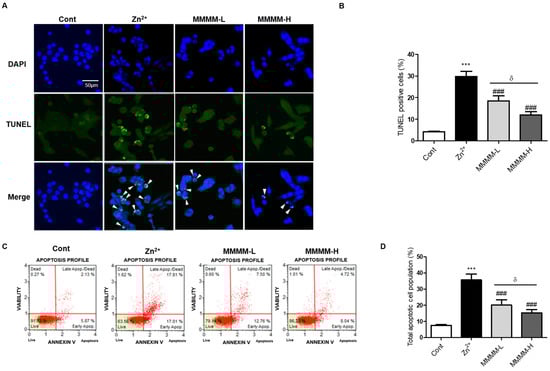To investigate the potential impact of MMMM on apoptosis during the process of Aβ-induced cell death, we conducted TUNEL- and FACS-based apoptosis assays. As depicted in Figure 2A,B, the quantity of TUNEL-positive cells undergoing apoptosis (indicated by a white arrowhead) exhibited a significant increase in the Zn2+ group. Conversely, the number of apoptotic cells noticeably decreased in both the MMMM-L and MMMM-H groups. Treatment with either 10 or 100 µg/mL MMMM alone did not exert any discernible influence on the nature of apoptosis in PC12 cells. These findings were corroborated by employing FACS and the Annexin V/7-AAD staining. As illustrated in Figure 2C,D, the Zn2+ group displayed a substantial elevation in the overall apoptotic rate when compared to the Cont group (36.06 ± 1.31 vs. 7.80 ± 0.49%, *** p < 0.001). However, both the MMMM-L and MMMM-H groups exhibited marked reductions in the total apoptotic rate relative to the Zn2+ group (20.11 ± 1.01 and 15.25 ± 0.78%, respectively, ### p < 0.001), and these reductions were dose-dependent (& p < 0.05). These outcomes suggest that treatment with MMMM can mitigate Aβ-induced apoptosis in neurons.