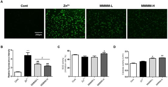 To investigate the potential inhibitory effects of MMMM on Aβ-induced ROS production in neuron-like PC12 cells, we employed H2DCFDA staining. As depicted in Figure 3A,B, the Zn2+ group exhibited a substantial increase in ROS levels compared to the Cont group (4.92 ± 0.04-fold, *** p < 0.001). In contrast, both the MMMM-L and MMMM-H groups demonstrated a remarkable reversal of this trend (2.87 ± 0.08 and 2.50 ± 0.09-fold of Cont, ## p < 0.01). We further investigated the impact of MMMM on the dynamics of SOD and Catalase activities, which are two major antioxidant enzymes associated with the inhibition of ROS generation. As illustrated in Figure 3C,D, the results revealed significantly higher SOD activity in the MMMM-H group, while both the MMMM-L and MMMM-H groups displayed elevated Catalase activity. These findings suggest that MMMM possesses the capability to suppress ROS generation by enhancing SOD and Catalase activities during the process of Aβ-induced neurotoxicity.