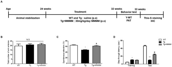 Effects of MMMM on memory impairment in the in vivo AD model. (A) The 5XFAD mice were treated with MMMM (30 mg/kg/day) for 8 weeks and underwent the indicated experiments in accordance with desired protocols. Using Y-MT, the extents of (B) total arm entries and (C) spontaneous alteration in mice groups administered with different treatments were obtained. Using PAT, (D) step-through latencies of mice groups administered with different treatments were quantified. In all graphs, * p < 0.05 and ** p < 0.01 vs. WT; # p < 0.05 vs. Tg. Data are represented as the mean ± standard deviation. p.o, per oral; Y-MT, Y-maze test; PAT, passive avoidance test; Thio-S, Thioflavin S; IHC, immunohistochemistry. N.S; no significance.