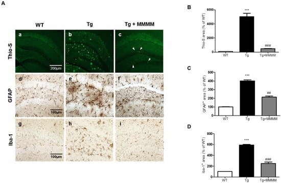 Effects of MMMM on Aβ deposits and neuroinflammation in in vivo AD model. (A) Representative images of Thio-S fluorescence (a–c) and the IHC showing GFAP+ astrocytes (d–f) and Iba-1+ microglia (g–i) in different mice groups. (B) Thio-S-stained and (C) GFAP- and (D) Iba-1-immunostained areas were expressed using quantitative bar graphs. In all graphs, *** p < 0.001 vs. WT; ## p < 0.01 and ### p < 0.001 vs. Tg. Data are represented as the mean ± standard deviation. Thio-S, Thioflavin S; GFAP, glial fibrillary acidic protein; Iba-1, ionized calcium-binding adapter molecule1.