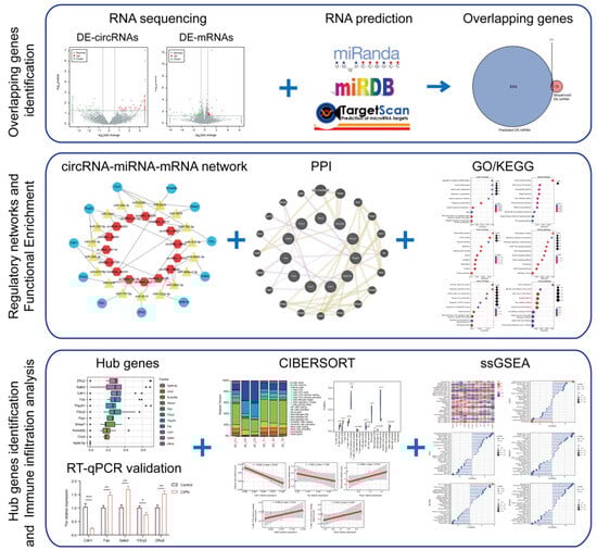 Flowchart of this study. The overlapping genes between DE-mRNAs and predicted mRNAs regulated by DE-circRNAs-targeted miRNAs were obtained first. CeRNA networks, PPI networks, and functional enrichment analyses were then performed. Next, hub genes were selected and validated by RT-qPCR. The immune infiltration analysis, immune cell correlation, and prediction of associated diseases, potential TFs, and effective drugs were also conducted. * p < 0.05; ** p < 0.01; *** p < 0.001.