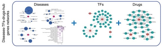 We utilized the disgenet2r R package to retrieve gene-disease associations of hub genes from DisGeNET (https://www.disgenet.org/, accessed on 3 July 2023) and grouped the diseases using the MeSH Disease Class [16]. For predicting potential transcription regulators of the hub genes, we employed TRRUST (https://www.grnpedi.org/trrust/, accessed on 13 July 2023). We used the drug prediction database DGIdb (https://dgidb.org/, accessed on 13 July 2023) to anticipate drugs for the hub genes. Subsequently, we downloaded the results to obtain the disease-hub genes, TF-hub genes, and drug-hub genes interaction networks. Finally, we utilized Cytoscape software 3.8.2 to visualize the graph.