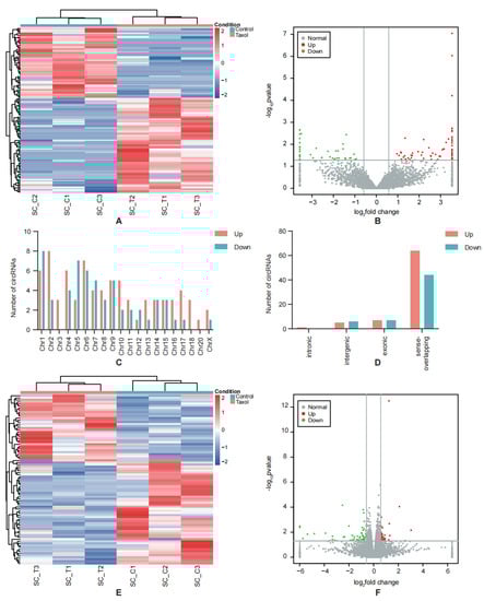 DE-circRNAs identification. (A) The heatmap of DE-circRNAs indicates the differentially expressed circRNAs between CIPN and control samples. (B) Volcano plot of all DE-circRNAs. (C) Chromosomal distributions of DE-circRNAs in CIPN and control samples. (D) Statistics of DE-circRNAs types. (E) The heatmap of DE-mRNAs indicates the differentially expressed mRNAs between CIPN and control samples. (F) Volcano plot of all DE-mRNAs. Green dots indicate the downregulated ones, and red dots indicate the upregulated ones.