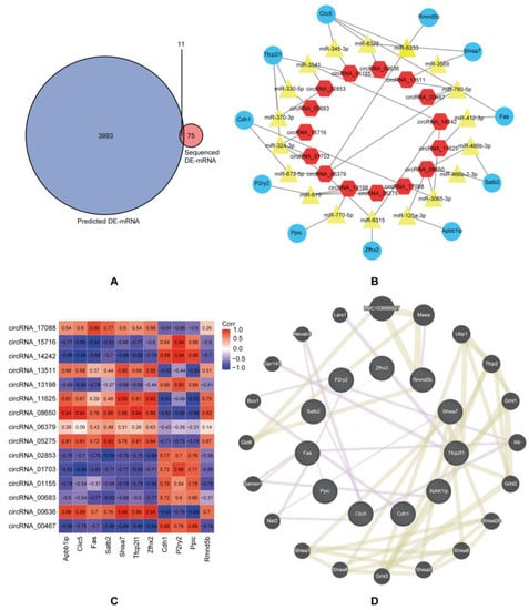 The circRNA-miRNA-mRNA regulatory network. (A) Venn diagram, sequenced DE-mRNAs in red, predicted DE-mRNAs in blue. (B) Representative circRNA-miRNA-mRNA network constructed by Cytoscape software 3.8.2. Blue dots indicate mRNAs, yellow dots indicate miRNAs, and red dots indicate circRNAs. (C) Correlations between DE-circRNAs and DE-mRNAs in CIPN. (D) Overlapping mRNAs and their co-expression genes were analyzed using the GeneMANIA database. Each node represents a gene. The purple lines represent the type of network interaction that is co-expression, and the yellow lines represent shared protein domains.