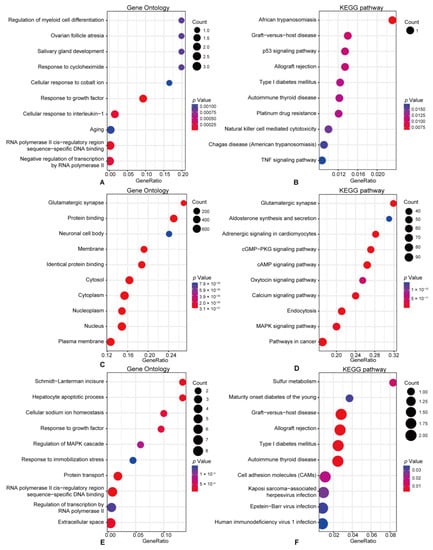 GO and KEGG analyses of the DE-mRNAs. (A,B) GO analysis and KEGG pathways analysis of the overlapping mRNAs. (C,D) GO analysis and KEGG pathways analysis of the predicted mRNAs. (E,F) GO analysis and KEGG pathways analysis of the DE-mRNAs between the CIPN and control tissues.