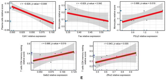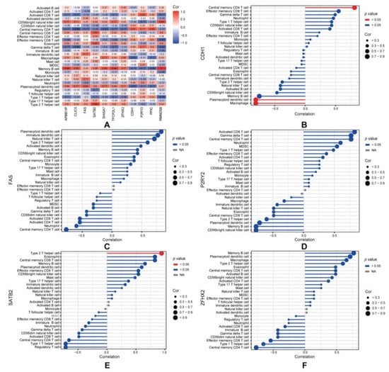 Analysis of correlation between overlapping mRNAs and immune cells. (A) The correlations between 11 overlapping mRNAs and immune cell infiltration in CIPN. (B–F) Correlations between CDH1 (B), FAS (C), P2RY2 (D), SATB2 (E), ZFHX2 (F) and infiltrating immune cells in CIPN.