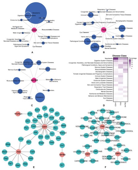 Disease-TF-drugs regulatory networks. (A–C) Disease Classes associated with hub genes. (D) Gene-Disease Class Heatmap. (E) TF prediction for hub genes based on the TRRUST database. (F) Drug-genes interaction network prediction. Red nodes represent hub genes. Blue nodes represent diseases, predicted TFs, or drugs.