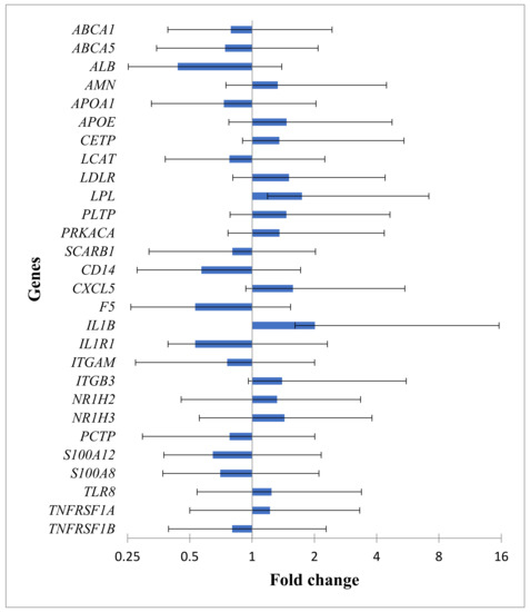 Analogously, seven genes in the atherogen cluster—C-X-C motif chemokine ligand 5 (CXCL5), interleukin 1 beta (IL1B), integrin subunit beta 3 (ITGB3), nuclear receptor subfamily 1 group H member 2 (NR1H2), nuclear receptor subfamily 1 group H member 3 (NR1H3), Toll-like receptor 8 (TLR8), and TNF receptor superfamily member 1A (TNFRSF1A)—were up-regulated, and eight genes—CD14 molecule (CD14), coagulation factor V (F5), interleukin 1 receptor type 1 (IL1R1), integrin subunit alpha M (ITGAM), phosphatidylcholine transfer protein (PCTP), S100 calcium-binding protein A12 (S100A12), S100 calcium-binding protein A8 (S100A8), and TNF receptor superfamily member 1B (TNFRSF1B)—were down-regulated.
