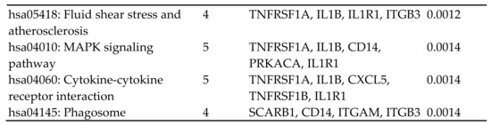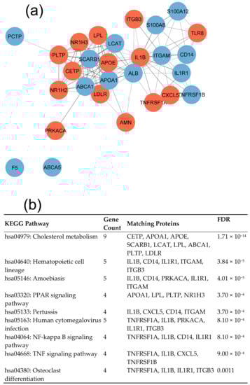 The PPI network created with STRING and exported to Cytoscape is given in Figure 2a for protein products of 28 DEGs. Thirteen of the forty significant KEGG pathways sorted by FDR and gene count (equal or higher than 4) are included in Figure 2b. They included cholesterol metabolism, Hematopoietic cell lineage, Amoebiasis, PPAR signaling pathway, Pertussis, Human cytomegalovirus infection, NF-kappa B signaling pathway, TNF signaling pathway, Osteoclast differentiation, Fluid shear stress and atherosclerosis, MAPK signaling pathway, Cytokine–cytokine receptor interaction, and Phagosome. Furthermore, the Toll-like receptor signaling pathway and the IL-17 signaling pathway, each with three participating nodes, were detected as well. Thus, both lipid, inflammation, and innate immunity-associated pathways are significant in CAD.