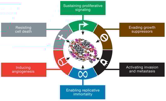 Non-communicable diseases such as cancer contribute to high global morbidity and mortality rates [25,26]. Cancer is described as a disease state in which there is anomalous cell development and uncontrollable cell division [27]. There are several hallmarks of cancer that describe the abilities of cancer cells to permit its progression, including the ability to sustain signaling of cell proliferation, eluding growth suppressors, and cell death resistance (Figure 1) [28]. Additionally, the induction of angiogenesis during the cancer disease state and the ability of cancerous cells to avoid destruction by immune cells are also included as the hallmarks of cancer. Moreover, the deregulation of cellular metabolism in cancerous cells and the activation of invasion and metastasis during disease progression also form part of the characteristics of cancer [28,29,30]. The hallmarks of cancer continue to be the cardinal points when it comes to understanding the microenvironment of various cancers and providing a systematic basis to target different cancers for improved therapies [31,32,33].