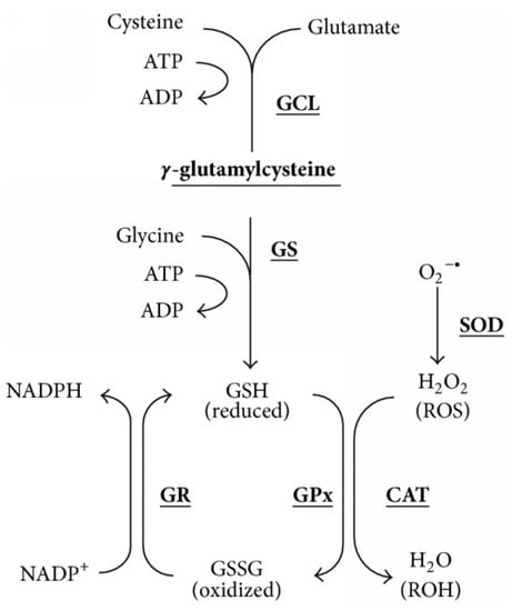 Glutathione reduction-oxidation reaction: Glutathione (GSH) consists of three amino acids. Glutathione peroxidase (GPx) is involved in the detoxification of ROS. The production of hydrogen peroxide (H2O2) results from the conversion of superoxide anion (O2−) by superoxide dismutase (SOD). An oxidized form, glutathione disulfide (GSSG), is produced and recycled back to GSH utilizing a glutathione reductase enzymatic reaction. A cofactor, Nicotinamide adenine dinucleotide phosphate (NADPH), is required for a redox reaction to occur [92].