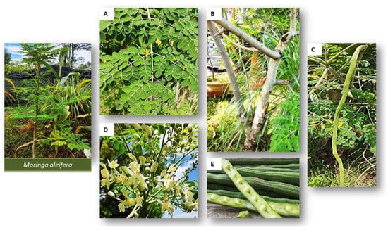 The various parts of Moringa oleifera tree (A) Leaves, (B) Stem and Bark, (C) Pods, (D) Flowers and sepals as well as (E) seeds [141].