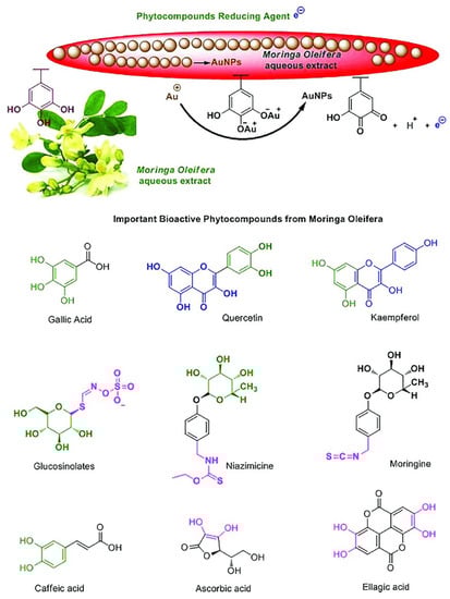 Chemical structures of bioactive compounds of MO. There are various compounds found in MO that make it a good chemotherapeutic agent. This includes Niazimicin as well as Kaemferol and Quercetin [146,151]. Moreover, the various colors demonstrate compounds that contained the water soluble hydroxyfunctional group which were responsible for the reduction of gold ions and the stabilization of gold nanoparticles (AuNPs).