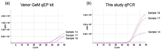 Amplification curves for Samples 14, 17, and 18 with (a) the Venor®GeM qEP kit and (b) this study’s qPCR. The x-axis indicates the number of RT-PCR cycles. The y-axis indicates the delta ΔRn, defined as the magnitude of the signal generated using the determined set of PCR conditions (the ΔRn value is the Rn value of an experimental reaction minus the Rn value of the baseline signal generated by the instrument).