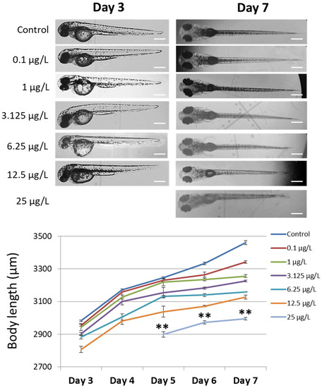 - Kimmel, C.B.; Ballard, W.W.; Kimmel, S.R.; Ullmann, B.; Schilling, T.F. Stages of embryonic development of the zebrafish. Dev. Dyn. 1995, 203, 253–310. [Google Scholar] [CrossRef] [PubMed]