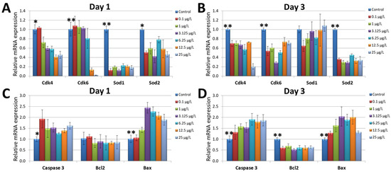3.4. Assessing the Transcript Expression of the Cell-Cycle-Related Genes, Oxidative-Stress-Related Genes, and Apoptosis-Related Genes