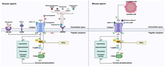 In the microenvironment of the female reproductive tract, many physiological chemicals, such as oviducal hormones, regulate sperm functions and increase [Ca2+]i []. In these hormones, P4 and PGs are the best known for the oviducal ligands of CatSper. They are secreted by the oviduct and serve as the predominant hormones in follicular fluid []. In addition, several physiological stimuli, including cyclic nucleotides, ZP glycoproteins, serum albumin, DEFBs, neurotransmitters, and odorant attractants, elicit a CatSper-dependent Ca2+ increase [] (Summarized in Figure 1).