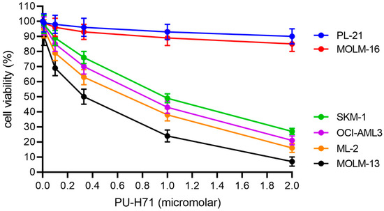 PU-H71 dose response in AML cell lines. AML cells were treated with the HSP90 inhibitor PU-H71 at the indicated dosages for 20 h. Cell viability data are average values of multiple repeat measurements per dosage.
