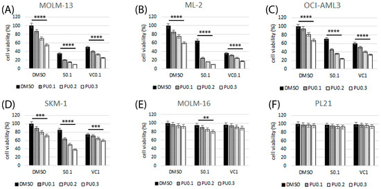 Susceptibility of AML cell lines to various treatment combinations. Cell viability was determined in AML cell lines MOLM-13 (A), ML-2 (B), OCI-AML3 (C), SKM-1 (D), MOLM-16 (E) and PL-21 (F) after 20 h of treatment with single compounds and in combination with 0.1–0.3 μM PU-H71 (PU) and 0.l μM S63845 (S0.1), 0.1 μM venetoclax (VC0.1), or 1 μM venetoclax (VC1). Significance of differences denoted for p < 0.01 (**); p < 0.001 (***); and p < 0.0001 (****).