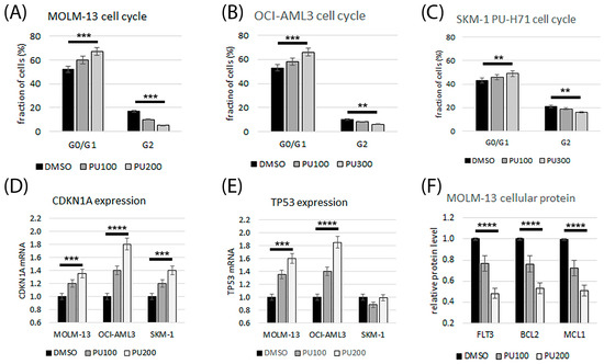 Induction of cell cycle arrest, gene expression, and protein degradation in AML cells treated with HSP90 inhibitor PU-H71 (PU). Cytometric analysis of AML cell lines MOLM13 (A), OCI-AML3 (B), and SKM-1 (C) after 20 h treatment with 100–300 nM PU-H71. According to DAPI staining, cell intensities were classified as the G0/G1 (2N) or G2 (4N) phase. Relative quantitation of CDKN1A (D) and TP53 (E) gene expression. Relative quantitation of FLT3, BCL2, and MCL1 protein levels in MOLM-13 cells treated with 100–200 nM PU-H71 (F). Significance of differences denoted for p < 0.01 (**); p < 0.001 (***); and p < 0.0001 (****).