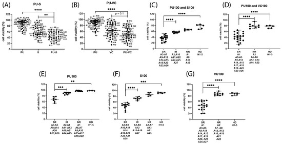 Hematological cells’ in vitro responses to PU-H71, S63845, and venetoclax. Cell viability was determined in mononuclear cells isolated from AML patients (A1-A27) and healthy donors (H1-H5) peripheral blood or bone marrow after 20 h treatment with 100 nM PU-H71 (PU), 100 nM S63845 (S), PU-H71 combined with S63845 (PU-S) (A), or PU-H71 combined with venetoclax (PU-VC) (B). The patient samples were sorted into response groups, namely substantial response (SR), intermediate response (IR), and minor (normal) response (NR) compared to healthy donors, treated with PU-H71 and S63845 (C), PU-H71 and venetoclax (D), 100 nM PU-H71 (E), 100 nM S63845 (F), and 100 nM venetoclax (G). The significance of differences in median values was calculated by Mann–Whitney test. Significance denoted for p < 0.01 (**); p < 0.001 (***); and p < 0.0001 (****).
