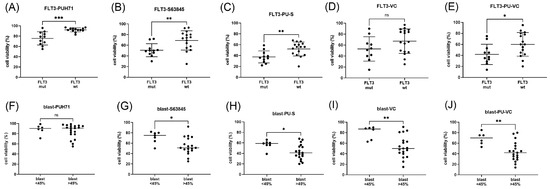 FLT3 status and blast cell percentage as biomarkers of responses to PU-H71 and BH3 mimetic combination treatments. Cell viability was determined in mononuclear cells isolated from AML patients’ peripheral blood or bone marrow after 20 h of treatment. Samples were grouped according to FLT3 genetic variation (A–E) or blast cell percentage (F,G). AML cells were treated in vitro with 100 nM PU-H71 (A,F), 100 nM S63845 (B,G), 100 nM venetoclax (C,H), PU-H71 combined with S63845 (D,I), or PU-H71 combined with venetoclax (E,J). The significance of differences in median values was calculated by a Mann–Whitney test. Significance of differences in median values was calculated by a Mann–Whitney test. Significance denoted for p < 0.05 (*); p < 0.01 (**); p < 0.001 (***); no significance denoted for p > 0.05 (ns).