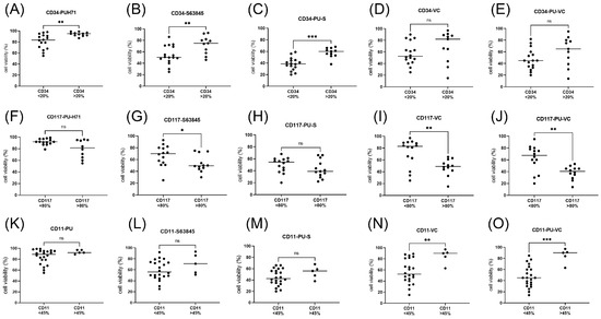 CD34, CD117, and CD11b biomarkers of responses to PU-H71 and BH3 mimetic combination treatments. Cell viability was determined in mononuclear cells isolated from AML patients’ peripheral blood or bone marrow after 20 h of treatment. Samples were grouped according to CD34 (A–E), CD117 (F–J), or CD11b (K–O) expression. Cells were treated in vitro with 100 nM PU-H71 (A,F,K), 100 nM S63845 (B,G,L), 100 nM venetoclax (C,H,M), PU-H71 combined with S63845 (D,I,N), or PU-H71 combined with venetoclax (E,J,O). Significance of differences in median values was calculated by Mann–Whitney test. Significance denoted for p < 0.05 (*); p < 0.01 (**); p < 0.001 (***); no significance denoted for p > 0.05 (ns).