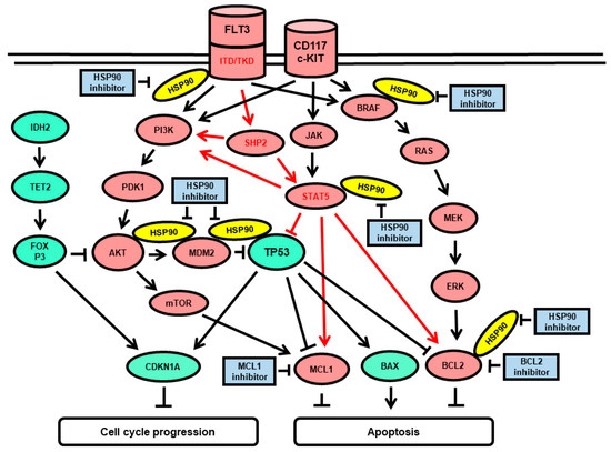 Schematic presentation of the FLT3 and c-KIT (CD117) induced signaling pathways and downstream effects. FLT3-ITD and FLT3-TKD are constitutively active growth factor receptors. C-KIT is an inducible growth factor receptor activated by stem cell factor (SCF) binding. Both tyrosine receptor kinases activate PI3K-AKT, RAS-MEK-ERK, and STAT5 leading to cell growth and proliferation via inhibition of the tumor suppressor TP53 and induction of the apoptosis regulators MCL1 and BCL2. HSP90 protein can bind and stabilize client proteins including AKT, BCL2, FLT3, JAK, MDM2, STAT5, SHP2, and BRAF. HSP90 proteins are indicated in yellow, oncogenic protein functions in red, tumor suppressor functions in green ovals, and targeted inhibitors in blue rectangles. Sharp arrows and blunt arrows indicate target induction and inhibition, respectively.