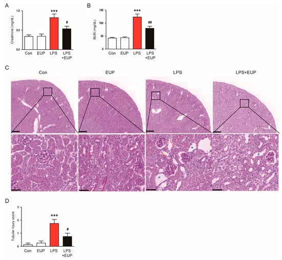 Male C57BL/6 mice (7 weeks old) were acquired from HyoSung Science (Daegu, Republic of Korea). All animal procedures were approved by the Institutional Animal Care and Use Committee of the Daegu Catholic University Medical Center (DCIAFCR-221007-26-Y). The mice were housed under standard temperature (20–24 °C) and humidity (60~70%) conditions. The mice were arbitrarily allocated to four groups (n = 8 in each group): the control group (Con), the EUP group, the LPS group, and the LPS+EUP group. The LPS and LPS+EUP groups received a single intraperitoneal administration of LPS (10 mg/kg; Sigma-Aldrich, St. Louis, MO, USA). EUP was obtained from Sigma-Aldrich and dissolved in 5% hydroxypropyl methylcellulose. In the EUP and the LPS+EUP groups, EUP (10 mg/kg) was intragastrically administered 1 h after LPS treatment. The Con and LPS groups were given an equal volume of the vehicle. The doses of EUP and LPS were chosen based on previous literature [22,24]. All mice were sacrificed 24 h after LPS treatment. Blood and kidney tissues were immediately harvested.