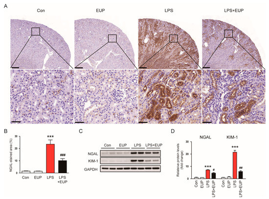 To confirm the action of EUP on renal tubular injury, we stained kidneys with an anti-NGAL antibody. NGAL is widely used as renal tubular injury marker because it is produced in renal tubular epithelial cells and increases rapidly after tubular injury [30,31]. The percentage of NGAL-stained area increased after LPS injection, whereas EUP decreased renal NGAL expression in LPS-treated mice (Figure 3A,B). This result was confirmed by Western blotting (Figure 3C,D). Renal expression of KIM-1, another renal tubular injury marker [28], was also increased after LPS injection, and EUP significantly decreased renal KIM-1 protein expression (Figure 3C,D).