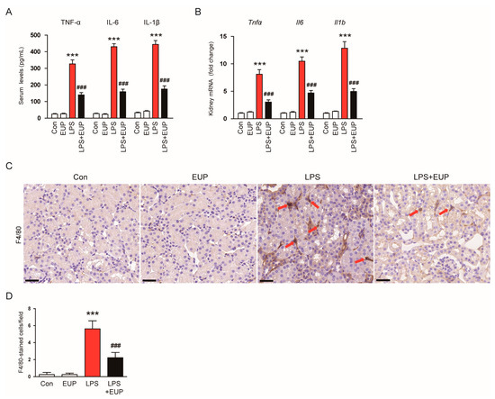 EUP alleviated inflammatory responses. (A) Serum levels of TNF-α, IL-6, and IL-1β. (B) Renal mRNA levels of TNF-α, IL-6, and IL-1β. (C) IHC staining for F4/80. Scale bar: 30 μm. (D) Number of F4/80-positive cells per field. n = 8 per group. *** p < 0.001 vs. Con. ### p < 0.001 vs. LPS.