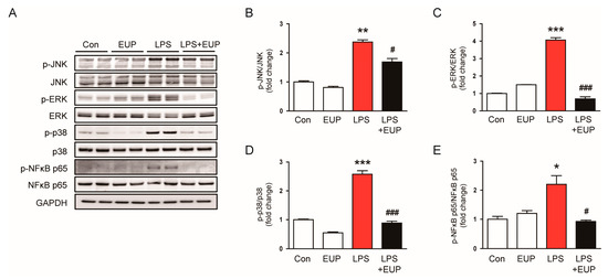 Mitogen-activated protein kinase (MAPK) and NF-κB signaling cascades play key roles in the inflammatory response of septic AKI [34,35,36]. Therefore, we next investigated the action of EUP on MAPK and NF-κB pathways in LPS-treated mice. LPS injection increased the phosphorylated forms of JNK, ERK, p38, and NF-κB p65, and the activation of MAPK and NF-κB cascades were significantly inhibited by EUP (Figure 5A–D).