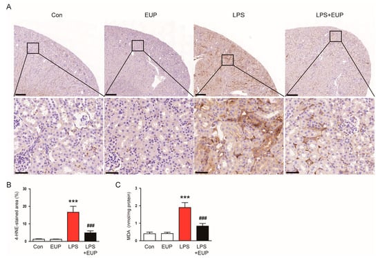 Oxidative stress is a hallmark of sepsis and plays a critical role in the pathophysiology of septic AKI [4,6]. Lipid peroxidation is the oxidative degradation of lipids and is widely used as an indicator of oxidative stress in cells and tissues [37]. Therefore, we performed IHC staining of kidneys with an antibody against 4-HNE, a byproduct of lipid peroxidation [37]. IHC staining revealed that LPS treatment increased 4-HNE expression, but the expression was markedly attenuated by EUP (Figure 6A,B). Renal levels of MDA, another byproduct of lipid peroxidation [38], were also decreased by EUP (Figure 6C).