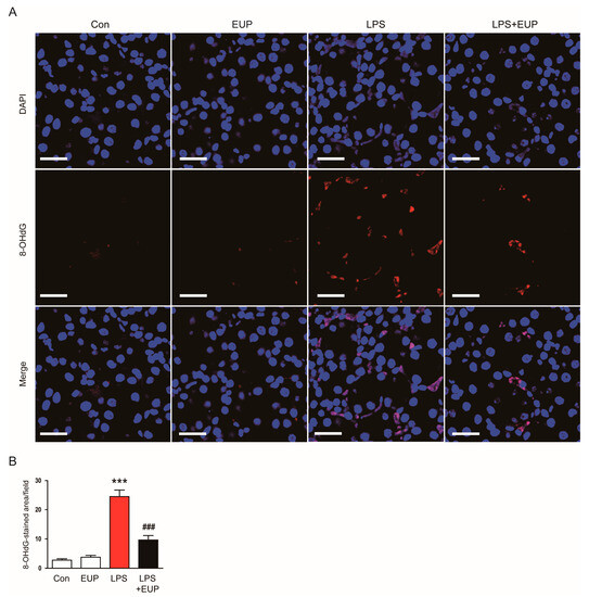 In addition to lipid peroxidation, we also examined the action of EUP on DNA oxidation. IF staining for 8-OHdG, a DNA oxidation marker [27], revealed that renal 8-OHdG levels increased in kidneys after LPS injection, whereas EUP significantly inhibited DNA oxidation (Figure 7A,B).