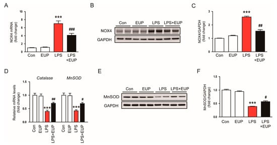Oxidative stress results from an imbalance between ROS production and antioxidant systems [39]. NOX4 is a primary source of ROS in the kidney and plays an important role in various kidney disorders [40,41,42]. Therefore, we next investigated NOX4 expression in the kidney. We observed an increase in NOX4 mRNA expression in kidneys after LPS injection, and this increase was mitigated by EUP (Figure 8A). This result was confirmed by Western blotting (Figure 8B,C). It has been shown that antioxidant enzymes such as catalase and MnSOD are inhibited in septic AKI [43,44]. The inhibition of catalase and MnSOD resulted in oxidative tissue damage by accumulation of ROS in tissues [43,44]. We also observed that LPS injection reduced mRNA levels of catalase and MnSOD, whereas EUP upregulated their expression in LPS-treated mice (Figure 8D). The increase in MnSOD expression by EUP was confirmed by Western blotting (Figure 8E,F).