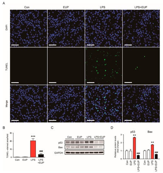 EUP alleviated renal cell apoptosis. (A) TUNEL staining (green). Nuclei were stained with DAPI (blue). Scale bar: 50 μm. (B) Number of TUNEL-stained cells per field. (C) Western blotting of p53 and Bax. (D) Relative band densities of p53 and Bax. n = 8 per group. ** p < 0.01 and *** p < 0.001 vs. Con. ### p < 0.001 vs. LPS.