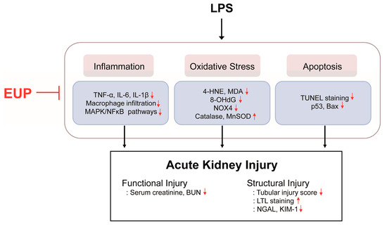 Schematic summary of the results of the present study. EUP ameliorated LPS-induced functional and structural renal injury through inhibiting inflammation, oxidative stress, and apoptosis.