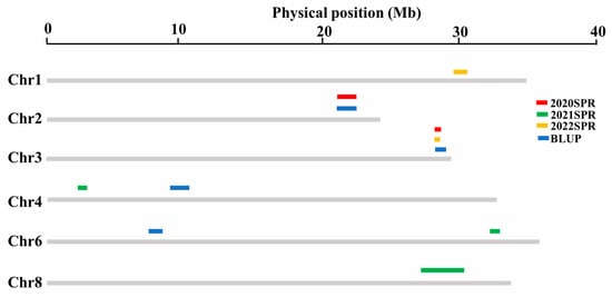 Under three growth environments and BLUP, 14 QTLs related to SSC were identified using Windows QTL Cartographer 2.5 software with the bin map. These 14 QTLs were scattered on chromosomes 1, 2, 3, 4, 6 and 8, as follows: 1 QTL on chromosome 1, 4 QTLs on chromosome 2, 4 QTLs on chromosome 3, 2 QTLs on chromosome 4, 2 QTLs on chromosome 6, and 1 QTL on chromosome 8 (Figure 3, Table S3). The physical distances of these QTLs ranged from 0.39 to 3.15 Mb, and the average distances was 0.88 Mb. The LOD value of these QTLs ranged from 3.2 to 5.7, and the phenotypic variation explained (PVE) values ranged from 6.7% to 13.8%. All the QTL showed negative additive effects, indicating that alleles from the high-SSC parent 1228 contributed to the greater SSC. Based on the physical position of flanking markers, the 14 QTLs were clustered into 10 common QTLs. Of the 10 common QTLs, one QTL was repeatedly detected across three environments, and two QTLs were detected across two environments. In addition, seven common QTLs were mapped to the same loci of previously reported QTLs (Table S3) and confirmed the reliability of the genetic map.