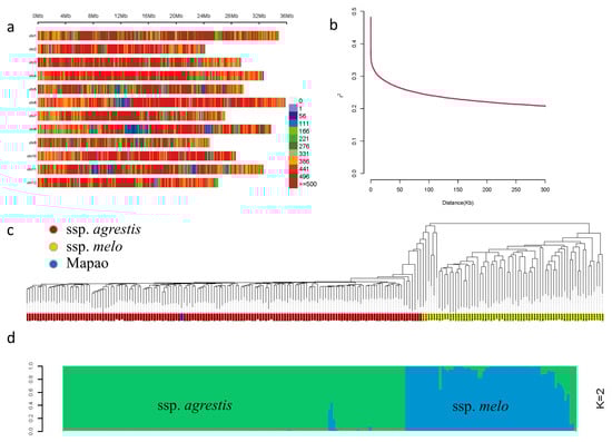 Distribution of the SNPs and the population structure of 213 melon accessions. (a) Distribution of SNPs and nucleotide diversity across the melon genome ‘HS_ZJU’. Different colors indicate the number of SNPs within the 0.1 Mb window size. (b) Genome-wide average LD decay for 213 melon accessions. (c) Phylogenetic tree of 213 melon accessions. (d) Population structure of melon accessions estimated by ADMIXTURE with k = 2.