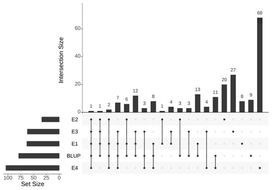 Intersection of significant SNPs across four different environments (E1, E2, E3, and E4) and BLUP.