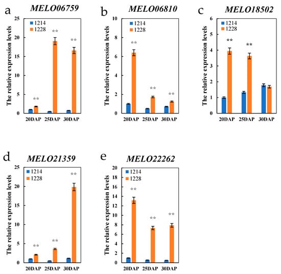 Relative expression levels of five candidate genes. (a) MELO06759; (b) MELO06810; (c) MELO18502; (d) MELO21359; and (e) MELO22262; ** Significant at p ≤ 0.01.