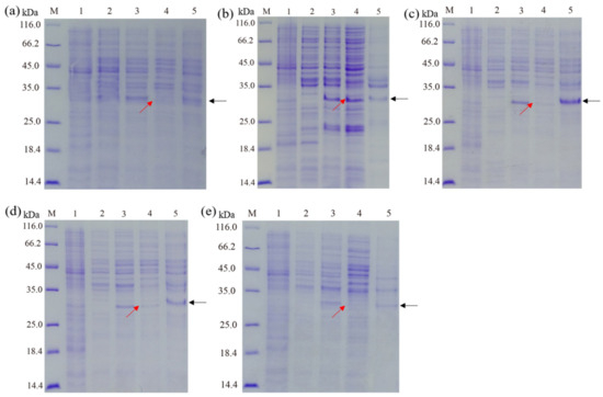 Media optimization for expression of recombinant proteins. (a) LB. (b) TB. (c) SOC. (d) SOB. (e) 2× YT. Lane M, marker; Lane 1, pSUMO-Mut vector; Lane 2, un-induced culture; Lane 3, induced culture; Lane 4, supernatant of the bacteria lysate; Lane 5, sediment of the bacteria lysate. The recombinant proteins in the supernatant and sediment of the bacteria lysate are indicated by the red and black arrows, respectively.