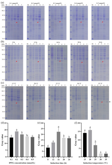 Effect of induction conditions on the expression of recombinant proteins (a) IPTG concentration. (b) Induction time. (c) Induction temperature. (d) Gray value of recombinant protein under different IPTG concentrations. (e) Gray value of recombinant protein under different induction times (f) Gray value of recombinant protein under different induction temperatures. Lane M, marker; Lane 1, pSUMO-Mut vector; Lane 2, un-induced culture; Lane 3, induced culture; Lane 4, supernatant of the bacteria lysate; Lane 5, sediment of the bacteria lysate. The recombinant proteins in the supernatant and sediment of the bacteria lysate are indicated by the red and black arrows, respectively. Different lowercase letters indicate significant differences among different treatments.