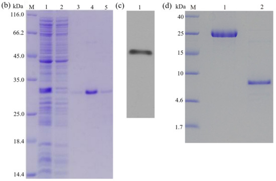 To increase the yield of soluble fusion peptide, a variety of independent cultivation parameters such as IPTG concentration (0.1, 0.2, 0.3, 0.4, and 0.5 mM), induction time (8, 12, 16, 20, 24 h), and induction temperature (15, 20, 25, 30, 35 °C) were optimized. The fusion peptide was quantified by SDS-PAGE and ImageJ software (version 1.53e, National Institutes of Health, Rockville, MD, USA).