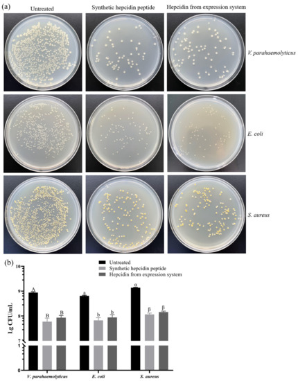 Antibacterial activities of hepcidin peptide prepared by different methods. (a) The photographs of bacteria colonies (diluted by 105 times; 100 μL). (b) The number of bacteria colonies. Different capital letters, lowercase letters, and Greek letters indicate statistically significant differences in the colony numbers of V. parahaemolyticus, E. coli, and S. aureus treated with different samples, respectively.